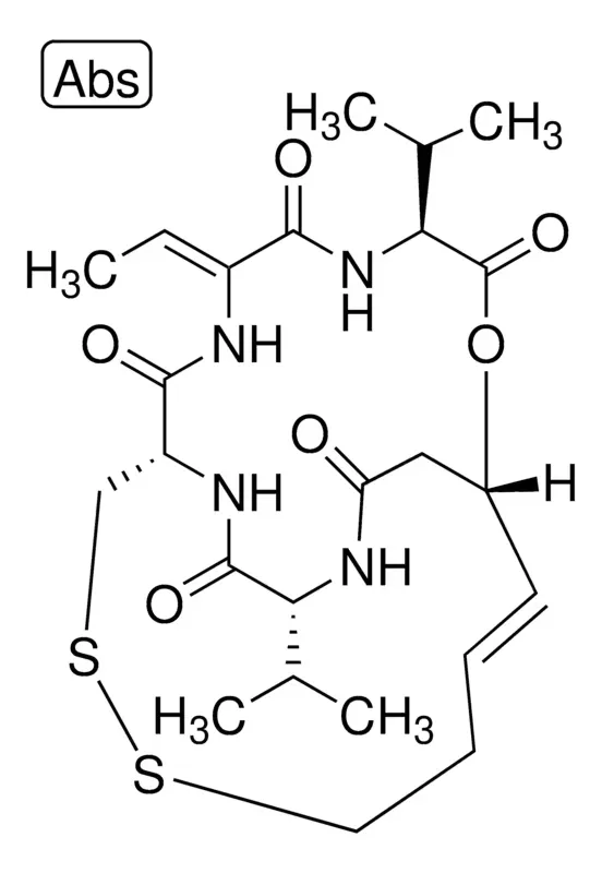 Ромидепсин — это природный депсипептид с высокой активностью, используемый в онкологии. Химическая формула: C₂₄H₃₆N₄O₆S₂. Вещество представляет собой кристаллический порошок от белого до светло-жёлтого цвета, хорошо растворимый в диметилсульфоксиде и этаноле. Продукт соответствует стандарту качества ≥98% по данным ВЭЖХ (высокоэффективной жидкостной хроматографии).